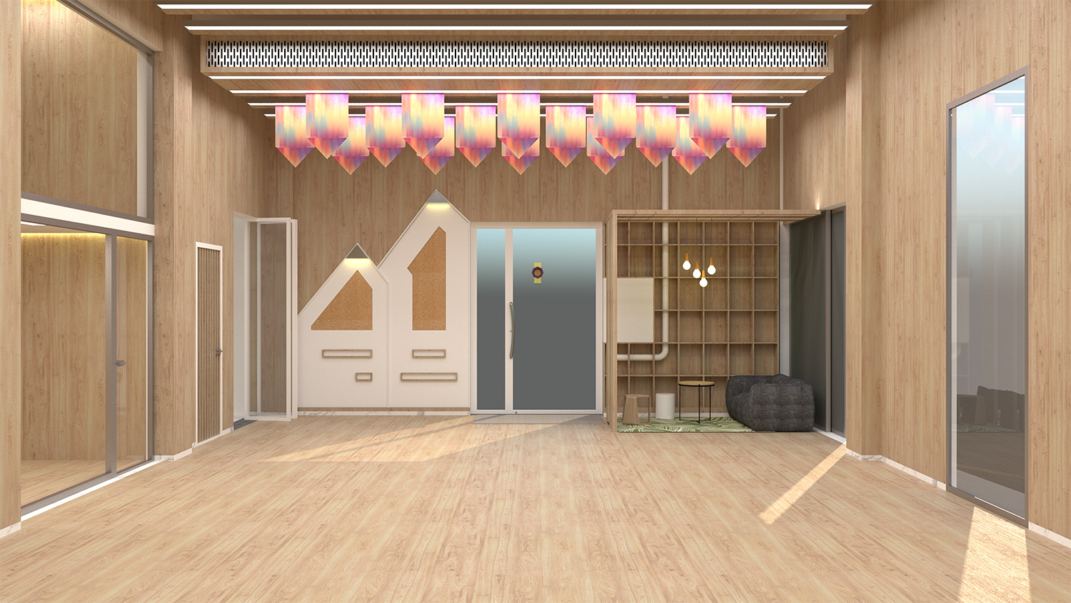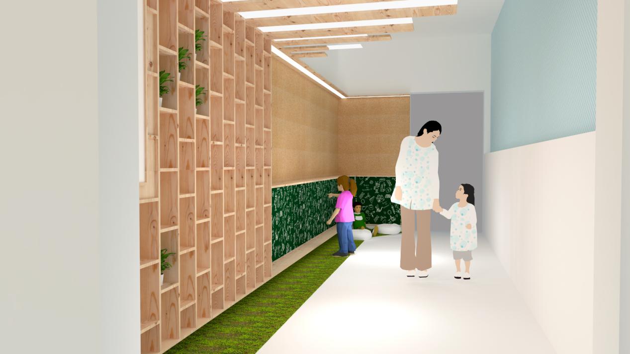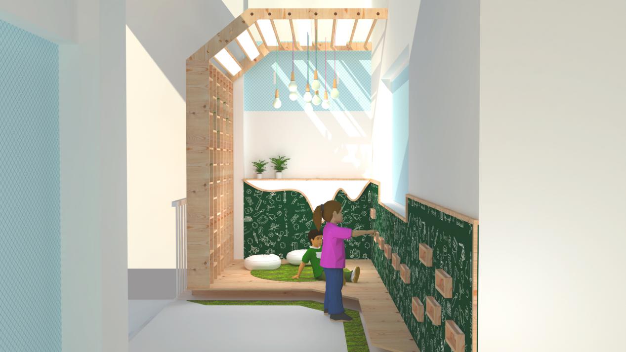 儿童的身心成长是本次项目设计的基础。为了增强儿童之间的交流与互动,中心设置了多处综合区域,包括图书角、音乐区、运动场、会议厅。教育不再局限于教室,无论教师或儿童都能从中找到惊喜与乐趣。项目摒除不必要的装饰,转而采用简单纯粹的设计。前厅的背景墙故意留白,用于投影播放孩子们的日常作品,在家长等候区我们设置了一个可以互相交流的咖啡休息区,让家长们在等候时,增加与空间的互动,也可以让家长们了解到幼儿园的文化特色。