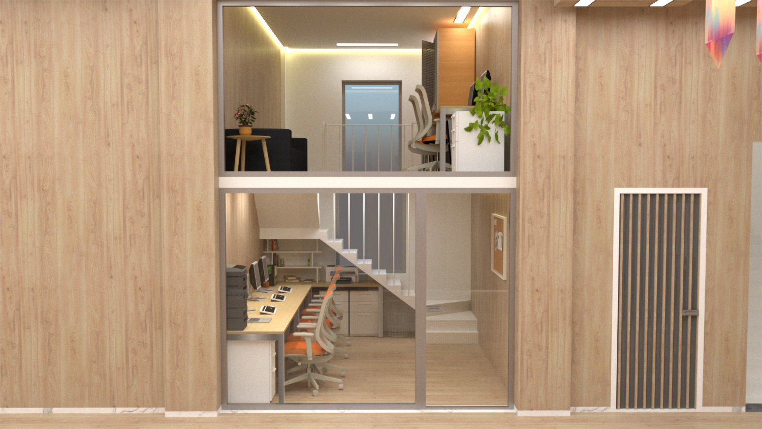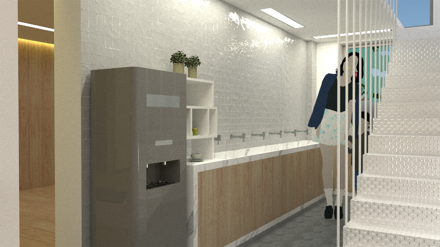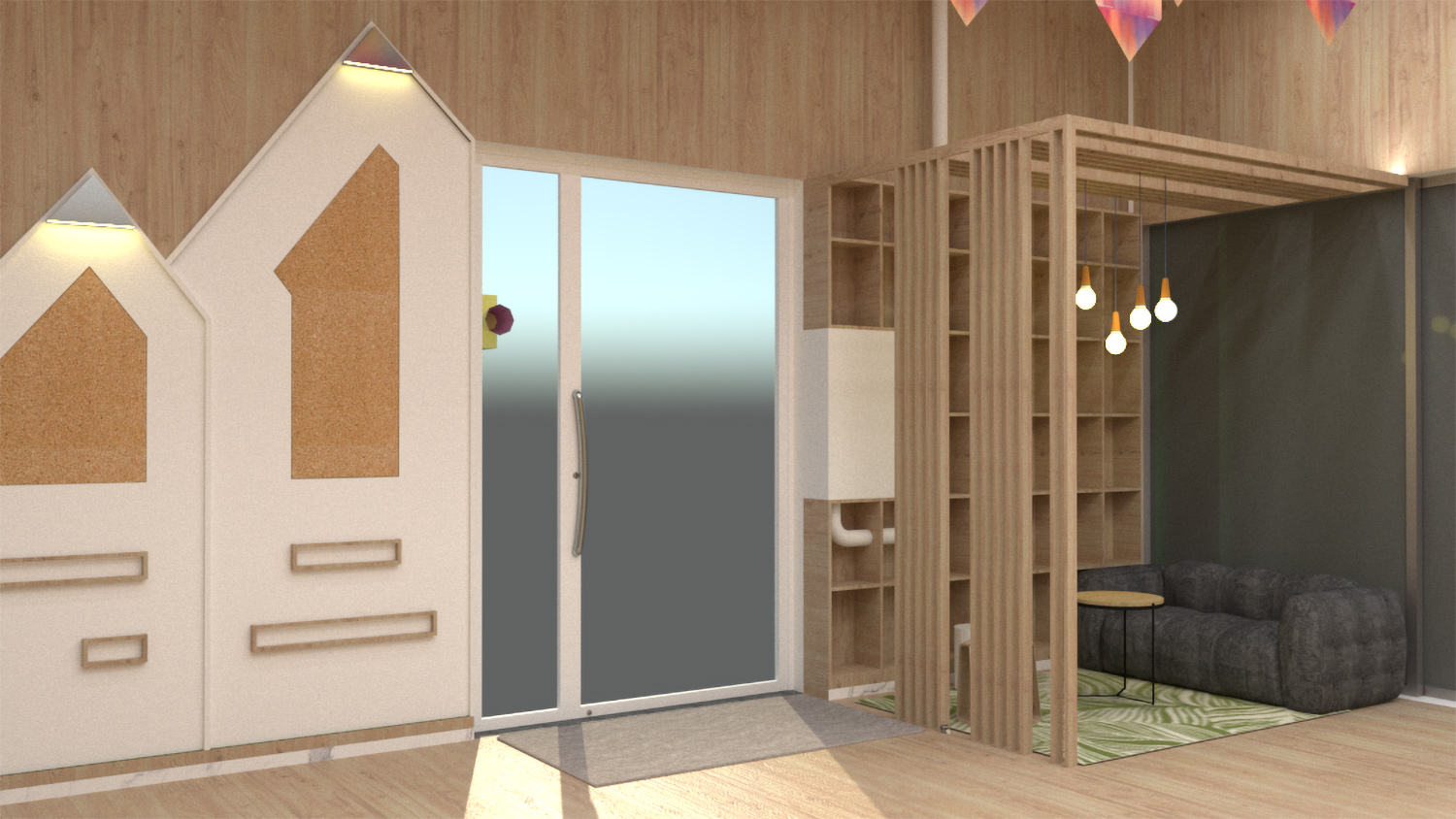 儿童的身心成长是本次项目设计的基础。为了增强儿童之间的交流与互动,中心设置了多处综合区域,包括图书角、音乐区、运动场、会议厅。教育不再局限于教室,无论教师或儿童都能从中找到惊喜与乐趣。项目摒除不必要的装饰,转而采用简单纯粹的设计。前厅的背景墙故意留白,用于投影播放孩子们的日常作品,在家长等候区我们设置了一个可以互相交流的咖啡休息区,让家长们在等候时,增加与空间的互动,也可以让家长们了解到幼儿园的文化特色。